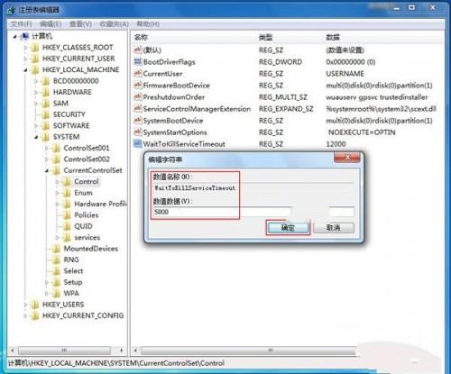 双击“WaitToKillServiceTimeOut”将其“数值数据”改为“5000”单击“确定”即可。(Windows7默认数值是12000代表12秒)