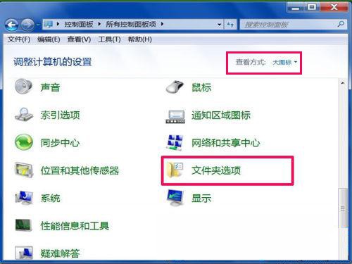 5、或者可以打开【控制面板】,将右上角【查看方式】设置成【大图标】,然后在下方找到【文件夹选项】双击打开即可