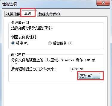 4、然后在性能选项弹窗中再次选择【高级】选项卡,点击【虚拟内存】下方的【更改】