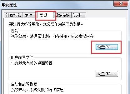 3、接着在系统属性界面中选择【高级】选项卡,再选择【性能】下方的【设置】