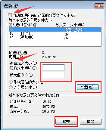 5、最后在虚拟内存界面将【自动管理所有驱动器的分页文件大小】取消勾选,再选择【自定义大小】,然后自行设置【初始大小】和【最大值】,设置好后先点击【设置】,再点击【确定】保存修改,系统会提示需要重启电脑,重启电脑即可