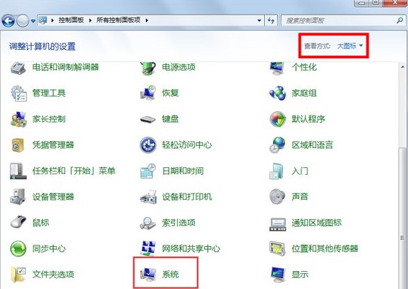 1、点击开始菜单,选择【控制面板】,将右上角【查看方式】设置成【大图标】,再找到【系统】选项