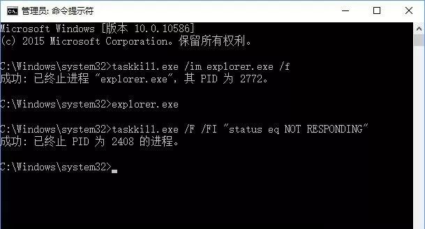 其中taskkill.exe是结束进程的程序,参数/im可以让你输入具体进程名称,explorer.exe是文件资源管理器的程序名(此处为举例),参数/f是强制执行。
