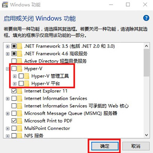 3、接着在显示的窗口中找到【Hyper-V】,并将其勾选,再点击【确定】