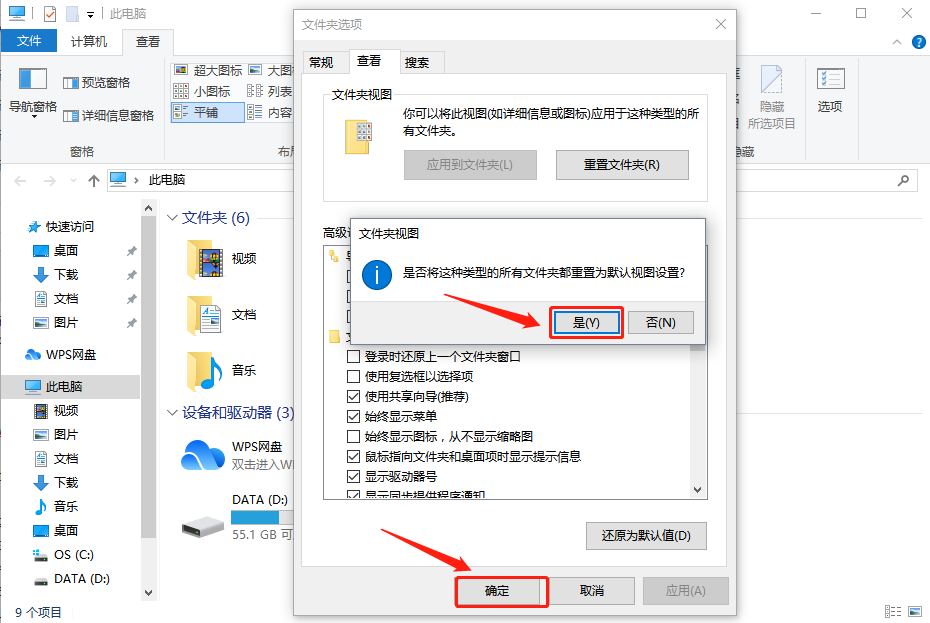 5、最后在弹出的提示窗口中选择【是】,在点击【文件夹选项】界面的【确定】