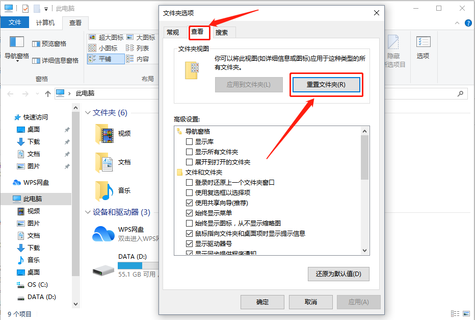 4、在打开的【文件夹选项】界面中同样选择【查看】选项卡,再点击下方的【重置文件夹】按钮