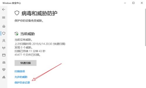 4、打开保护历史记录以阻止威胁和隔离威胁,并单击已隔离威胁。