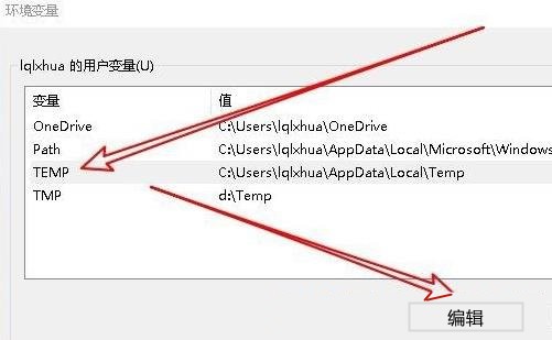4、环境变量窗口,选择TEMP文件,再点击编辑;
