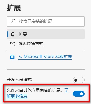 实际到新版Edge浏览器,我们需要进行一些设置,使得Edge浏览器可以安装其他应用商店的扩展。依然回到扩展管理界面,打开左边栏下方“允许来自其他应用商店的扩展”选项就行了。