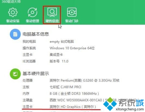 3、检测完毕后切换到“硬件信息”界面我们就可以看到“主显卡”后面会显示出显卡的型号了!