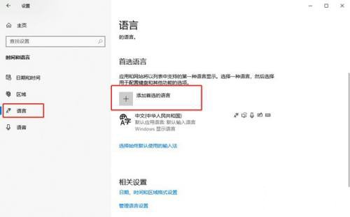 3、在时间和语言界面的左侧选择【语言】,再点击右侧的【添加首选的语言】选项