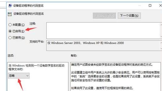 6、最后勾选“已启用”并将选项改成“忽略”再确定保存即可禁用强制签名。