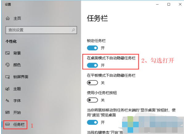 2、在任务栏设置中,按顺序,先在左侧选择“任务栏”,右侧将“在桌面模式下自动隐藏任务栏”勾选打开。