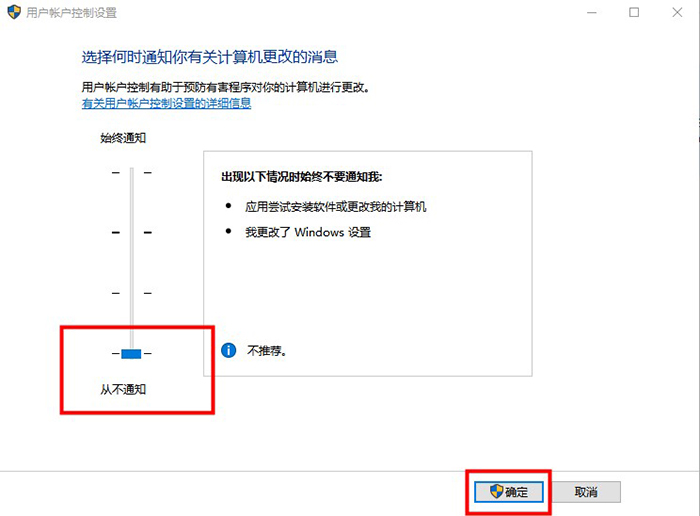 4、最后在【用户账户控制设置】界面中将左侧的选项设置成【从不通知】,再点击【确定】保存修改即可