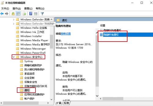 3、然后找到【windows安全中心】并展开,选择【通知】,在右侧界面中双击打开【隐藏所有通知】选项
