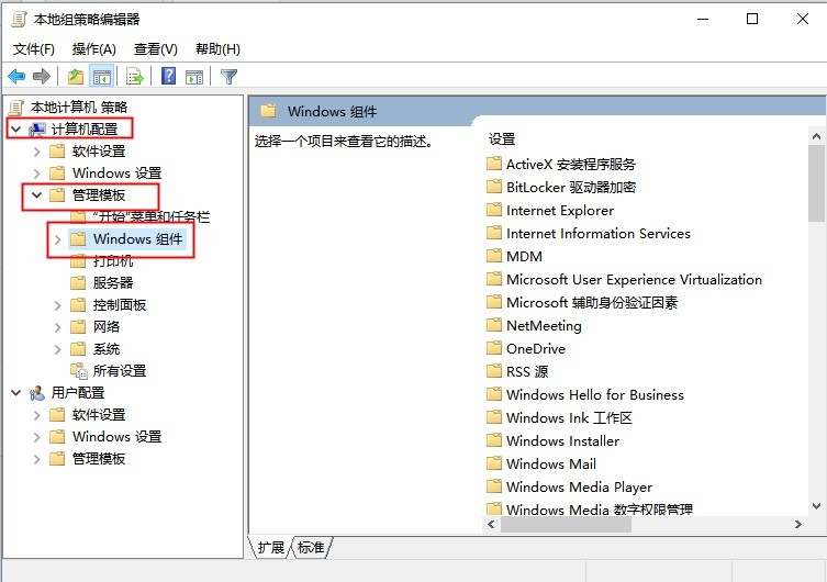 2、接着在打开的【本地组策略编辑器】界面中展开左侧【计算机配置】下方的【管理模块】,并选择【windows组件】