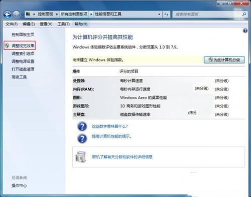 然后在“性能信息和工具”窗口中点击左边的“调整视觉效果”。