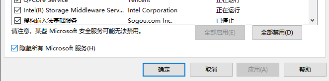 4、切换到“服务”标签页,点击以选中“隐藏所有 Microsoft 服务”的复选框,然后单击“全部禁用”。