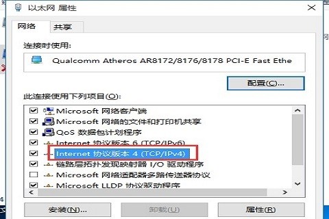 6、在属性界面,点击“此连接使用下列项目”下放的“internet 协议版本 4(TCP/IPV4)”然后点击“属性”;