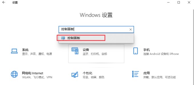 1、点击左下角开始菜单,选择【设置】,在windows设置界面中搜索【控制面板】