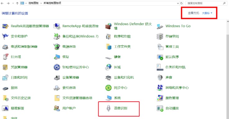 2、在控制面板界面中将右上角【查看方式】设置成【大图标】,再选择【语音识别】