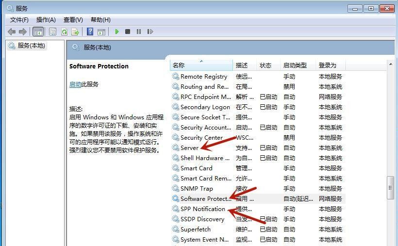 3、选择服务。进入与方法一相同的界面。依次将“sever”、“Software Protection”、“SPP Notification Service”三个服务项设置为启动状态,这样就能解决桌面黑屏的问题。