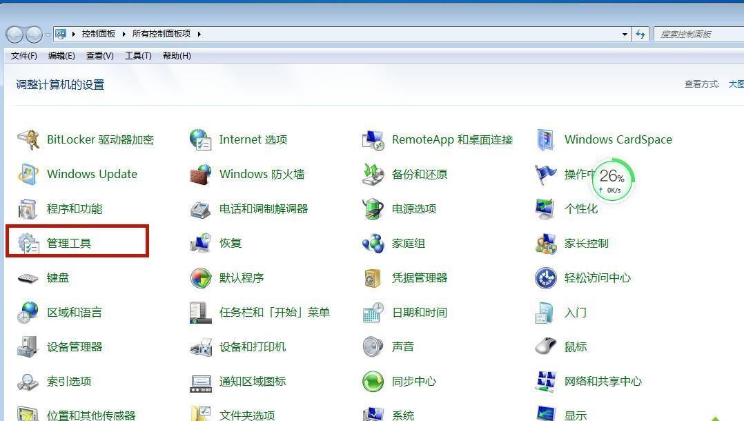 2、更改左上角的查看模式为“大图标”,单击“管理工具”;