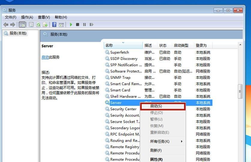 2、找到“server”功能,并且鼠标右键点击,在新菜单中中选择“启动”。之后将“Software Protection”和“SPP Notification Service”服务项同样设置为启动状态。之后重启电脑即可。