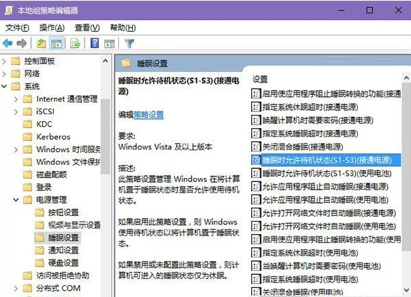 • 展开“计算机配置”—“管理模板“—“系统”—“电源管理“—“睡眠设置”,在右侧找到“睡眠时允许待机(S1-S3)(接通电源)”以及“睡眠时允许待机(S1-S3)(使用电池)”。