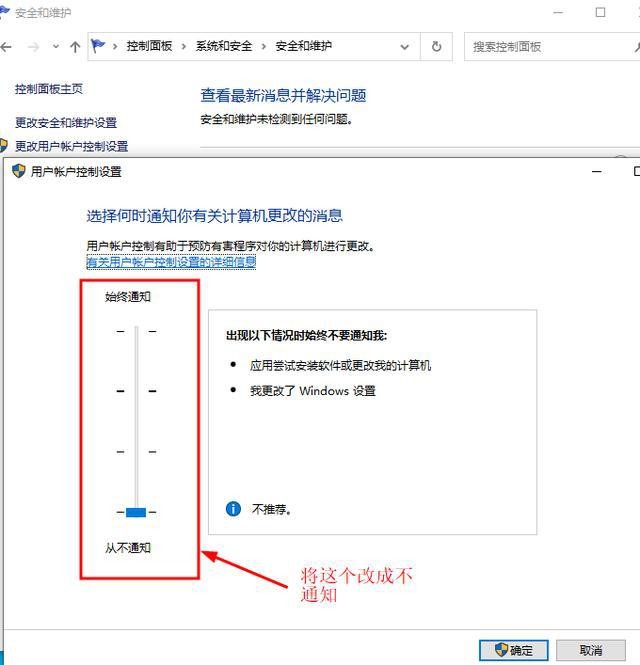 三、控制面板(control)→系统和安全→安全和维护→更改用户账户控制设置→改成从不通知。