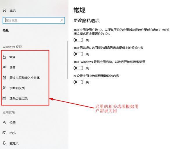 (windows权限:常规、活动历史记录;应用权限:位置、后台应用)