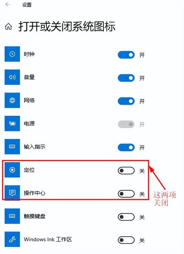 七、关闭操作中心/定位(设置→个性化→任务栏→打开或关闭系统图标)