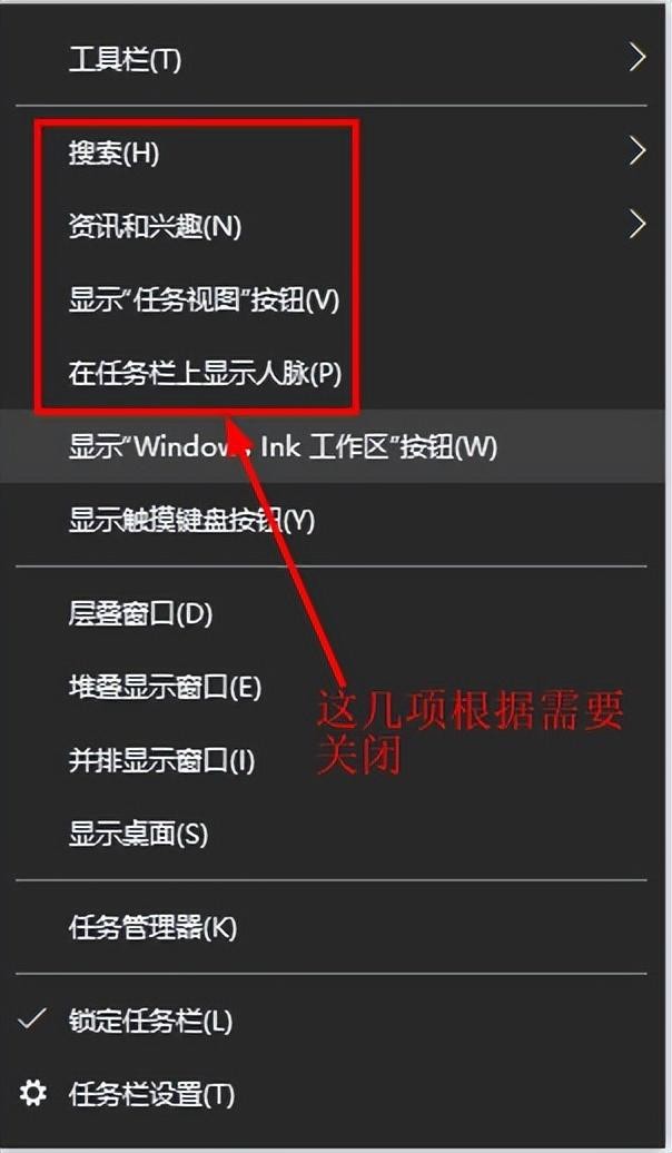 五、将在任务栏鼠标右键搜索/资讯和兴趣/cortana(小娜)/任务栏视图/人脉等选项全部关掉。