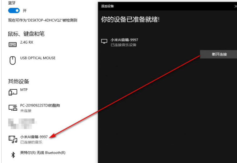 7、点击连接,连接刚刚搜索到的小爱音响,小爱音响和window10电脑的连接完成。