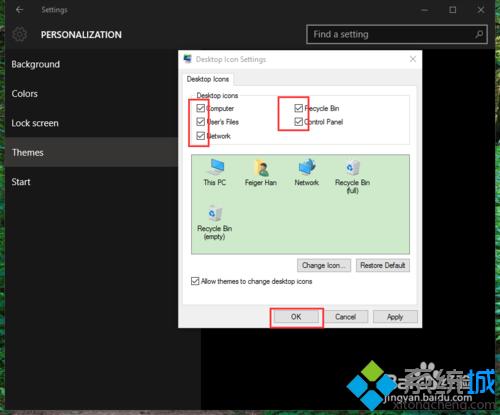 3、选择桌面图标设置 如图所示,选择左栏的主题那行后,在右栏中选中“桌面图标设置”,系统就会弹出桌面图标设置对话框。