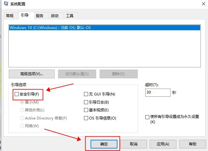 5、如果想关闭开机自动进入安全模式,我们在安全模式下同样通过在【运行】中输入【msconfig】,在系统配置的【引导】选项中将【安全引导】选项取消勾选,再点击【确定】后重启电脑即可