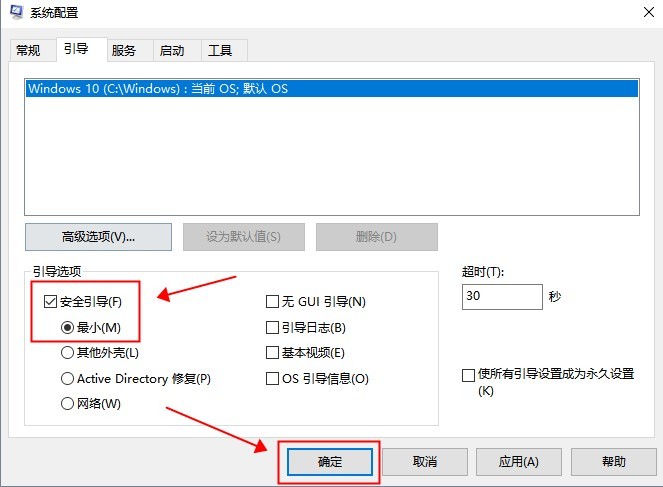 3、接着在引导界面的【引导选项】栏目中将【安全引导】勾选,下方的选项设置成【最小】,再点击【确定】保存修改