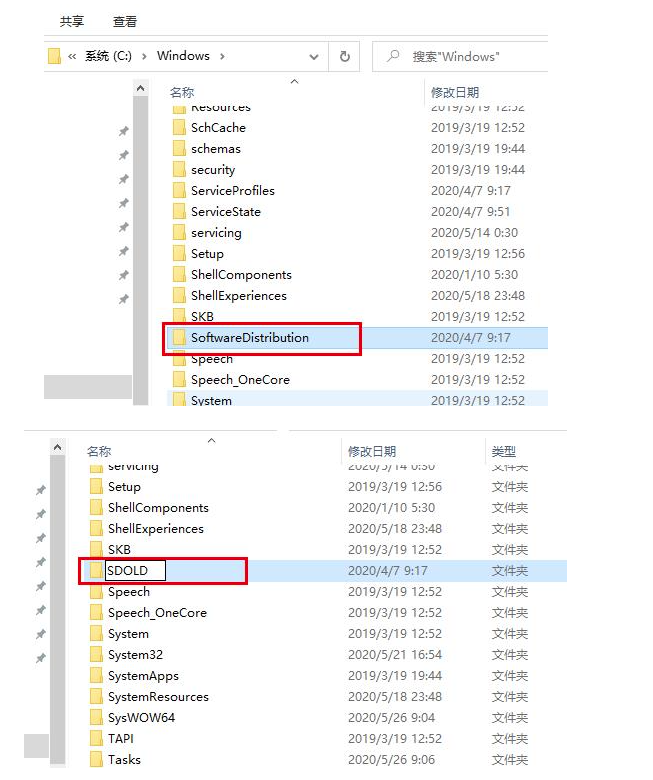 3、打开“此电脑”将C盘windows下的Softwaredistribution文件夹重命名为SDOLD。