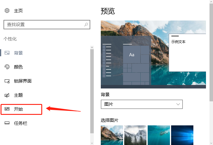 2、接着在个性化界面中选择左侧的【开始】选项卡