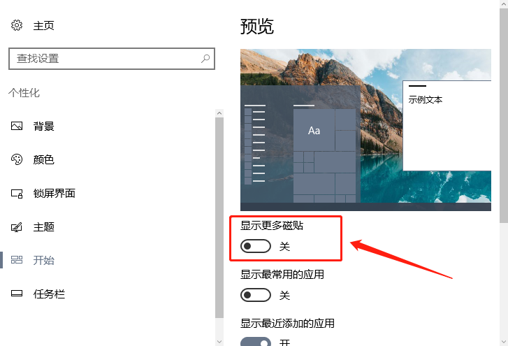 3、然后找到右侧界面的【显示更多磁贴】,将下方的开关打开就可以扩大磁贴页面,关闭磁贴页面就会减小,根据需求设置即可