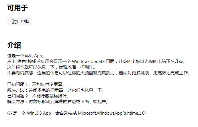 据APP介绍,“这是一个玩笑 App。 点击“摸鱼”按钮后应用会显示一个 Windows Update 画面,让你的老板以为你的电脑正在升级。 这时候你就可以休息一下,适当的休息可以让你的大脑重新充满活力,能面对更多挑战,更高效地完成工作。”