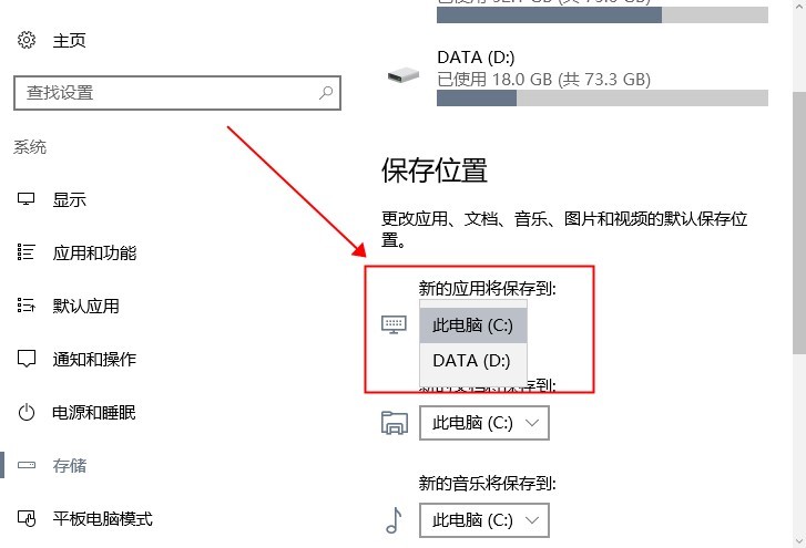 4、然后在右侧界面中点击【新的应用将保存到】下面的下拉框,选择想要设置的存放位置