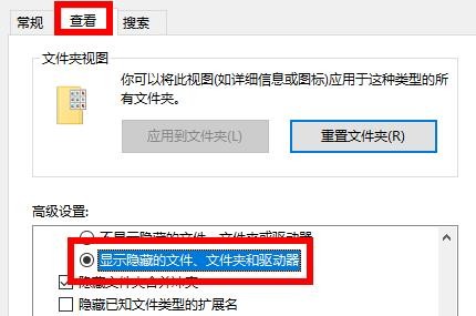 2、在“查看选项”栏中,选择“显示隐藏的文件、文件夹和驱动器”,单击“确定”。