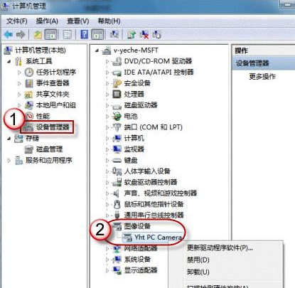 2、在“计算机管理”窗口左边一栏,双击“设备管理器”。然后,从右边栏中找到“图像设备”,点开。在摄像头设备上右键鼠标,选择“属性”。