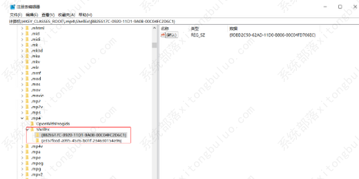 2、在注册表左侧显示框找到计算机\HKEY_CLASSES_ROOT\.mp4路径:计算机 \HKEY_CLASSES_ROOT\.mp4\ShellEx\{BB2E617C-0920-11D1-9A0B-00C04FC2D6C1}。