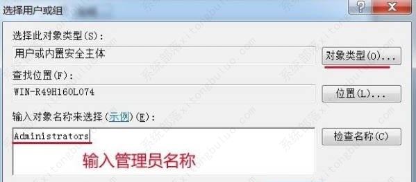 5、在选择用户或组窗口的输入对象名称来选择(U)栏中输入管理员名称。Administrators,再点击。对象类型(O)。如下图所示。