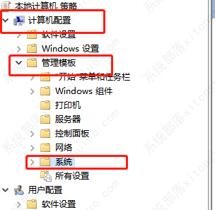 2、进入组策略编辑器后,依次点击左侧中的“计算机配置——管理模板——系统”。