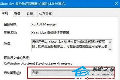 3. 在Xbox Live身份验证管理器属性中点击“启动”按钮,并将启动类型设置为“自动”,然后点击确定退出就可以了,如果还无法登录则重启电脑让设置生效。