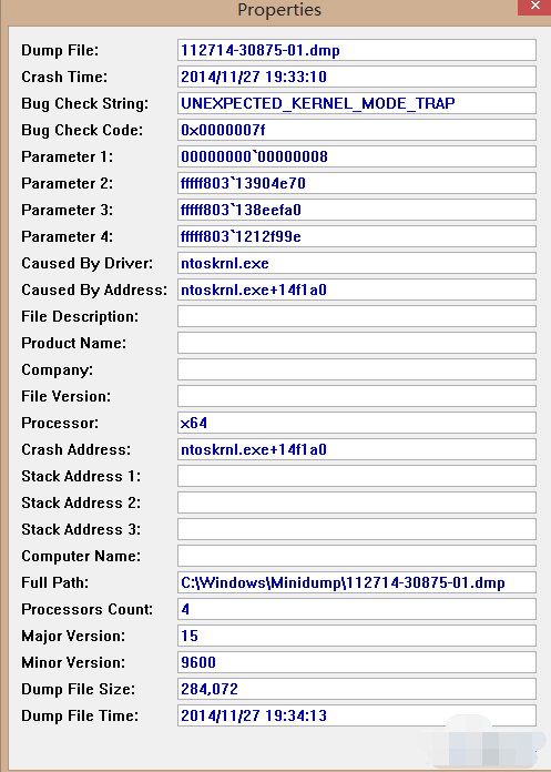 4、然后双击其中一个蓝屏dmp文件,就会弹出详细显示此次蓝屏的参数,然后对蓝屏故障参数百度搜索相关的解决蓝屏方案。