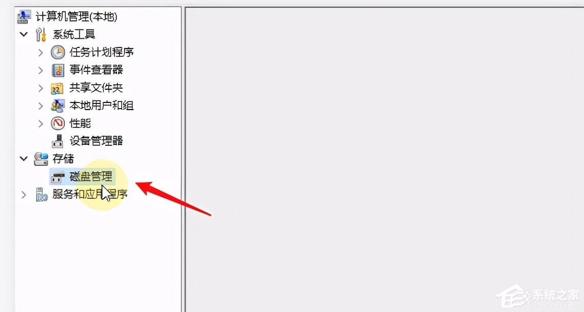 3、进入计算机管理窗口,在左侧栏点击【存储】——【磁盘管理】选项;